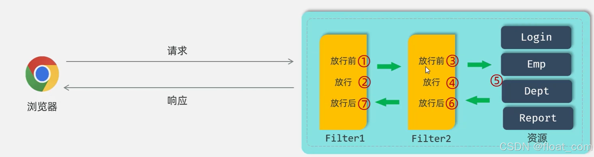 从图中可以清晰地看出:Filter 是将大门的门卫,而 Interceptor 是核心办公区前台的内卫。 无论请求到达多深,执行完毕后原路返回的顺序始终是严格对称的(U型回溯)。