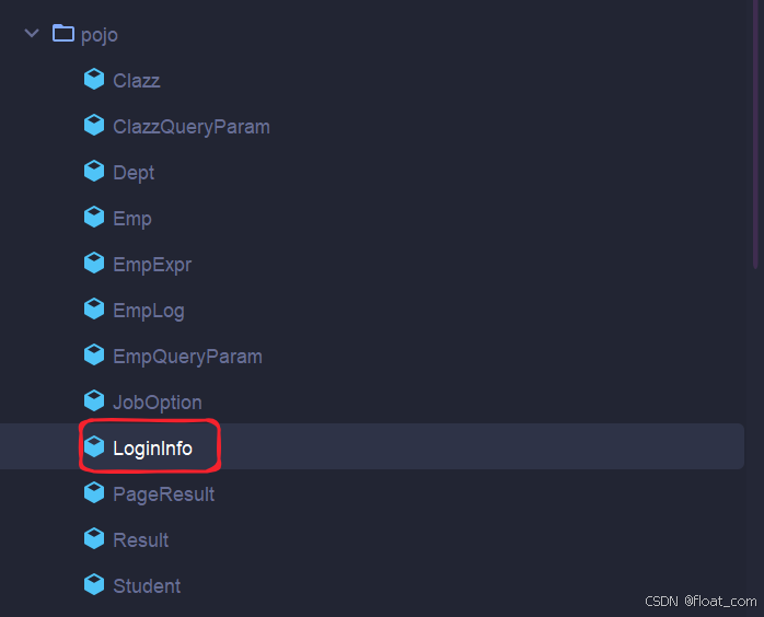 为了安全和规范,我们通常不会把数据库实体类(如 Emp)直接返回给前端 ,而是专门设计一个 LoginInfo 作为 DTO (数据传输对象):