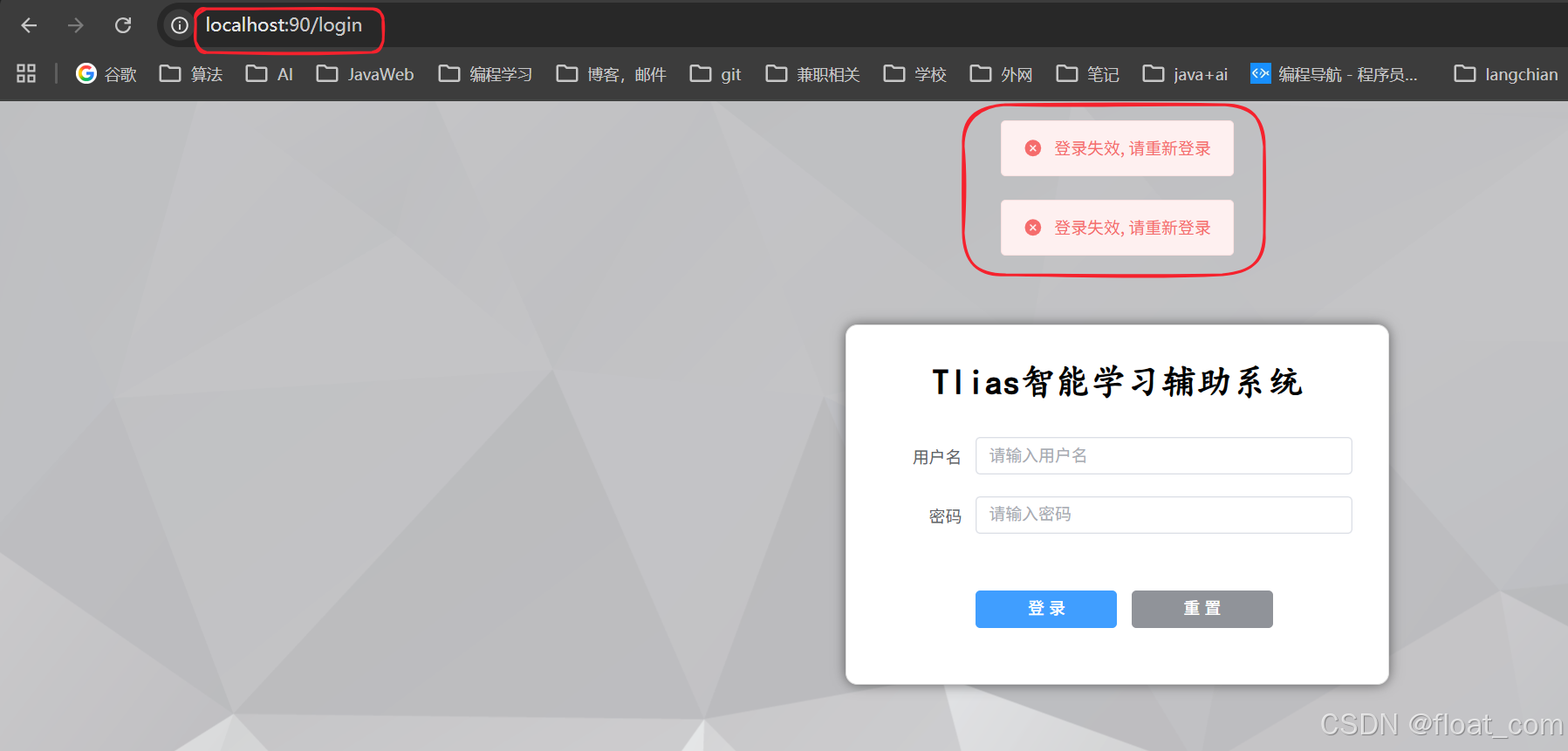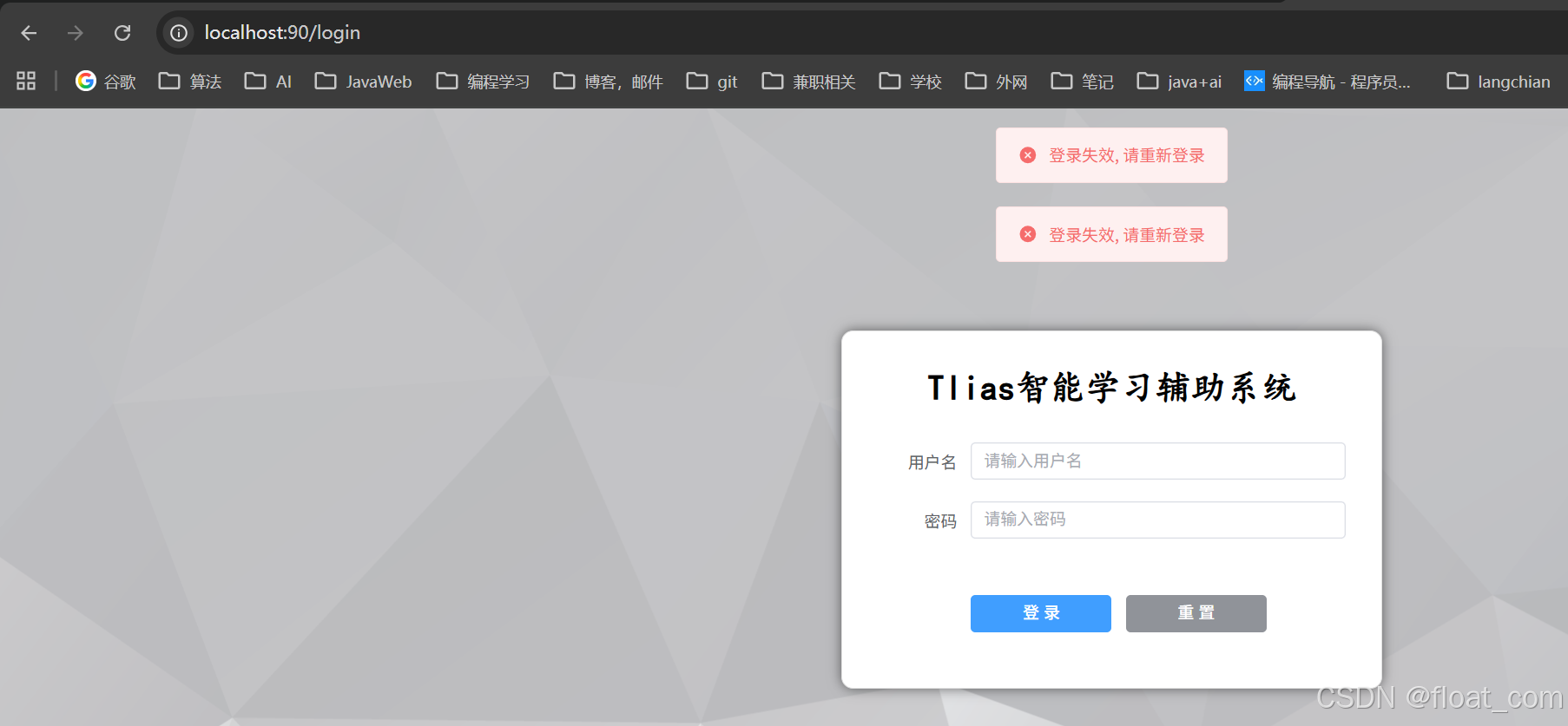 在浏览器未登录(无 Token)的状态下,直接尝试访问后台主页。Interceptor 验签失败直接返回 401 状态码,前端侦测到异常后,自动强制跳转回登录界面,并弹出"登录失效"提示。