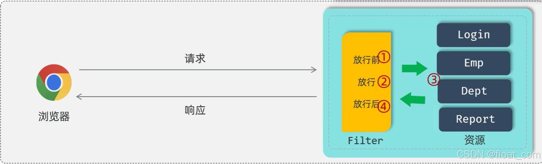 Controller (业务控制器) Interceptor (拦截器) DispatcherServlet (Spring 核心) Filter (过滤器) 浏览器 (客户端) Controller (业务控制器) Interceptor (拦截器) DispatcherServlet (Spring 核心) Filter (过滤器) 浏览器 (客户端) 1. 发起 HTTP 请求 2. 放行 (执行 doFilter 前置逻辑) 3. 分发请求 4. preHandle (返回 true 放行) 5. 执行完业务逻辑,返回数据 6. 依次执行 postHandle & afterCompletion 7. 返回 Servlet 响应 8. 执行 doFilter 后置逻辑,响应到达浏览器