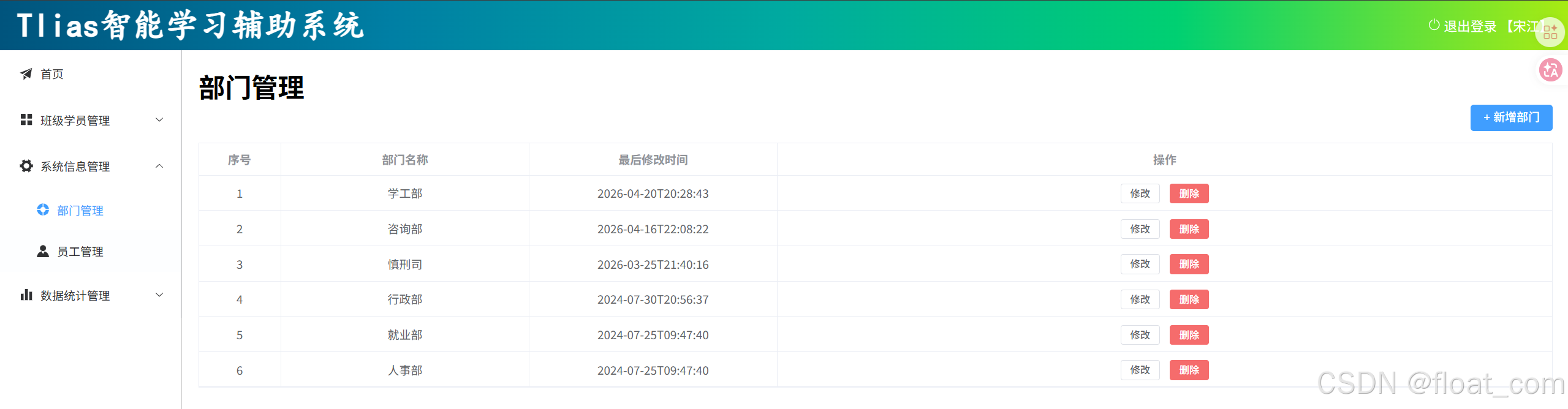 * 姓名:员工真实姓名,用于前端界面展示(如:欢迎您,宋江)