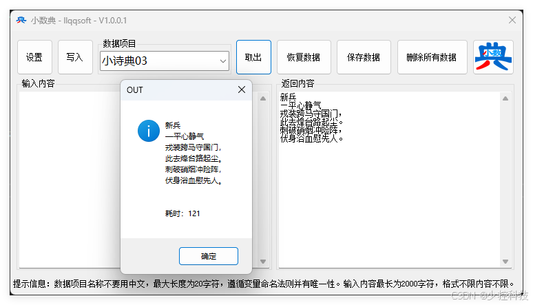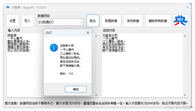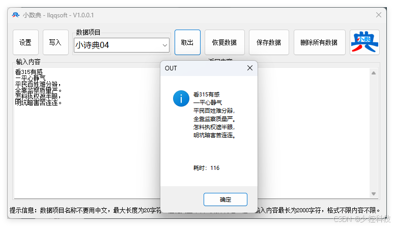 MessageBox.Show(value+"\r\n耗时:" + t.ElapsedMilliseconds.ToString(), "OUT", MessageBoxButtons.OK, MessageBoxIcon.Information);