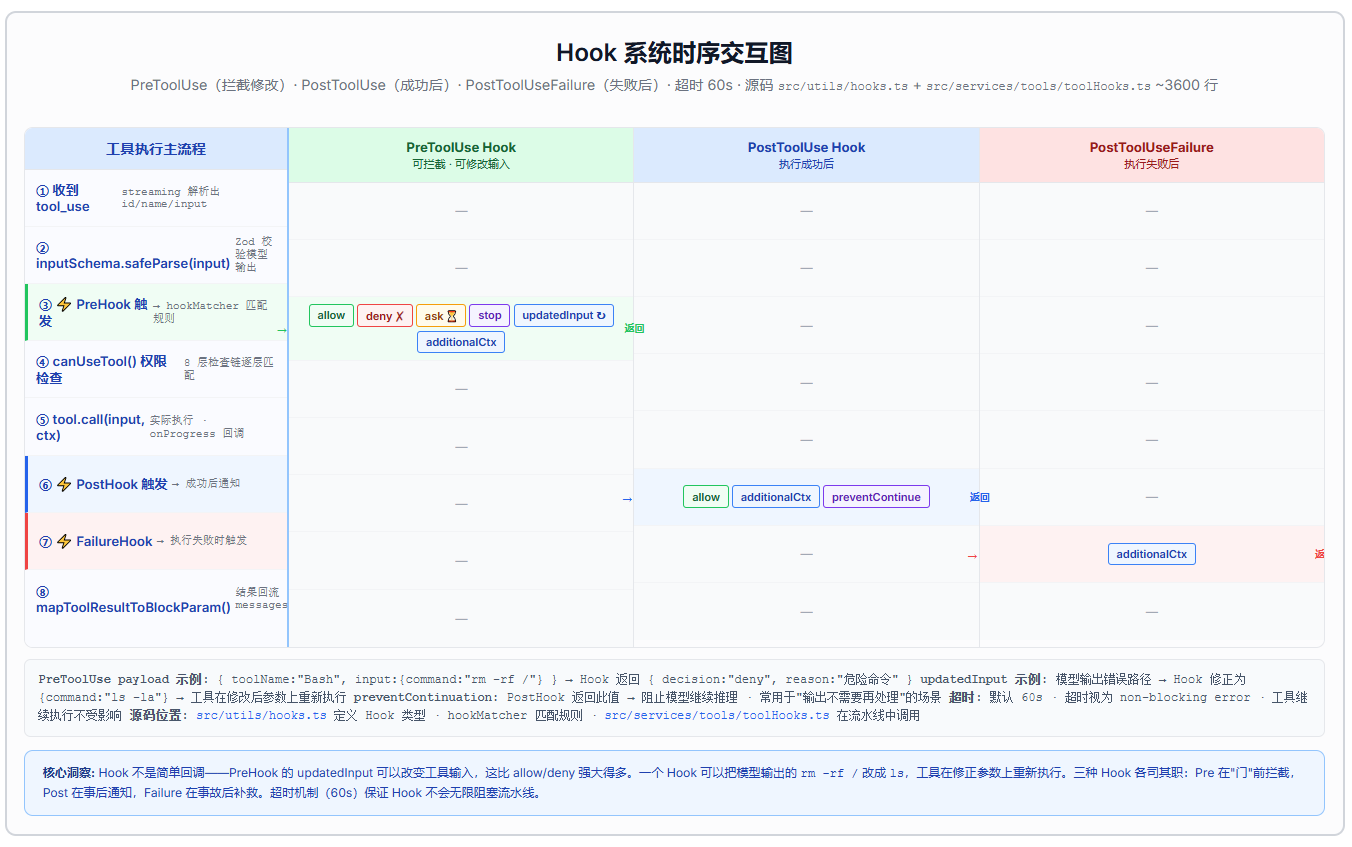 权限系统的 8 层检查链是姊妹篇Claude Code 深度拆解:工具系统------权限、沙盒与错误处理的核心内容,这里只讲它在流水线中的位置:在 Hook 之后、执行之前。 这个顺序很重要------Hook 可以修改输入,权限检查的是修改后的输入。