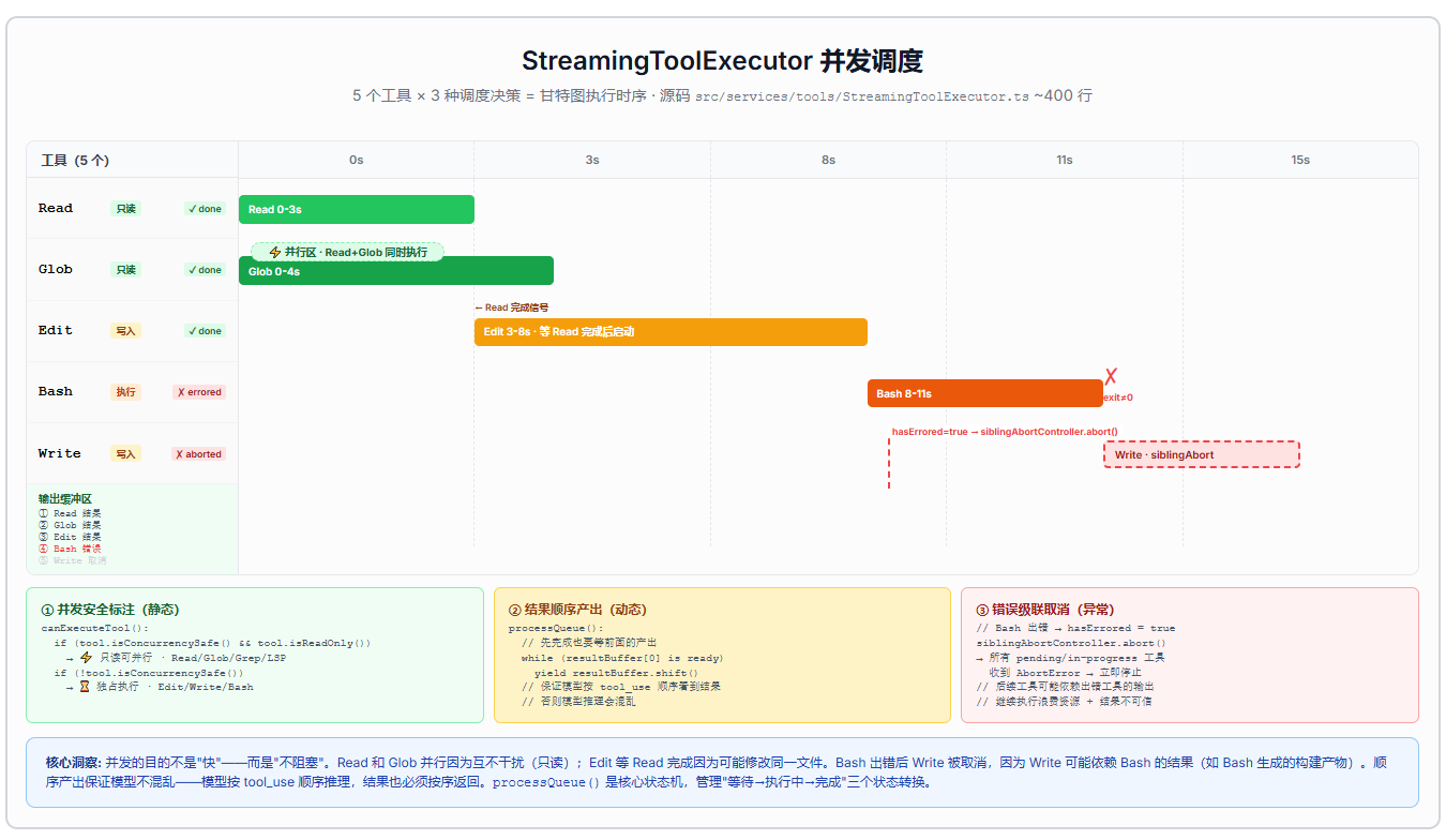 为什么?因为后续工具可能依赖出错工具的输出。假设模型同时调用了 Read 和 Edit------Read 读取文件内容,Edit 修改文件。如果 Read 出错了,Edit 的修改可能基于错误的信息,继续执行只会让事情更糟。