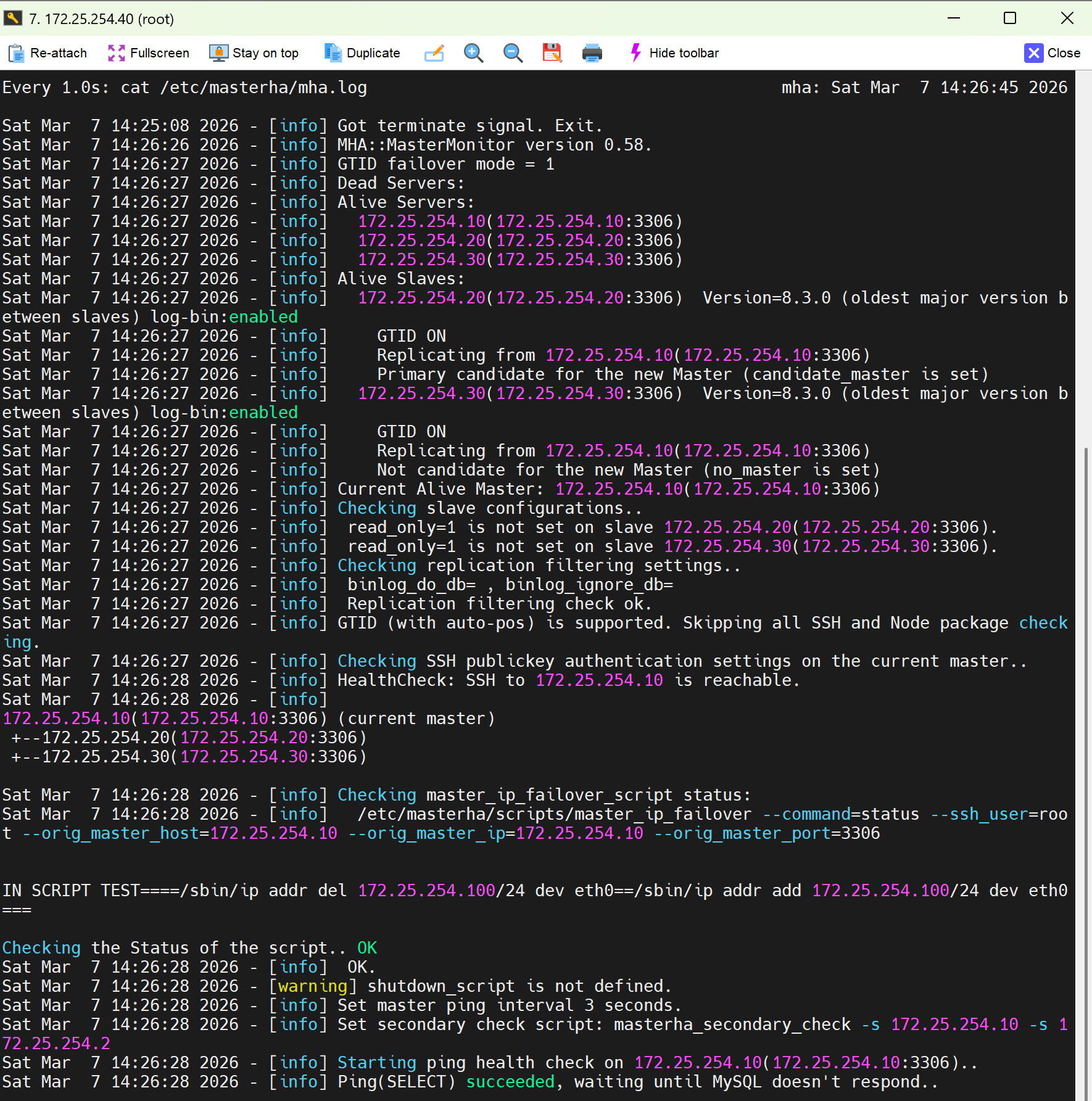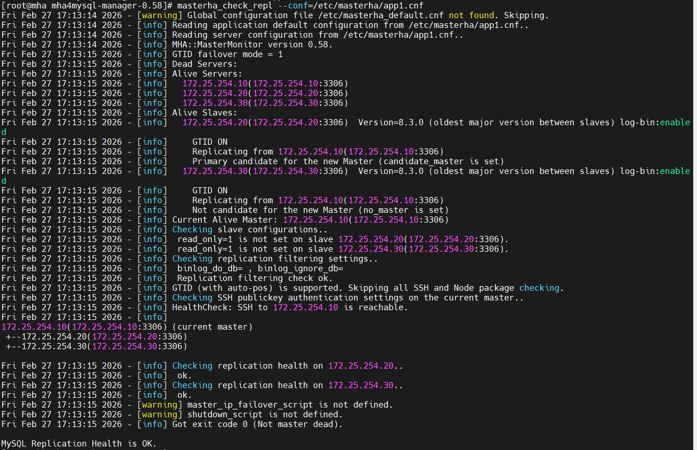 /data/mysql/*.err)和 MHA 日志(/etc/masterha/mha.log)是定位问题的第一手资料。 - 逐步验证 :每完成一个复制拓扑(如 GTID、半同步),先用