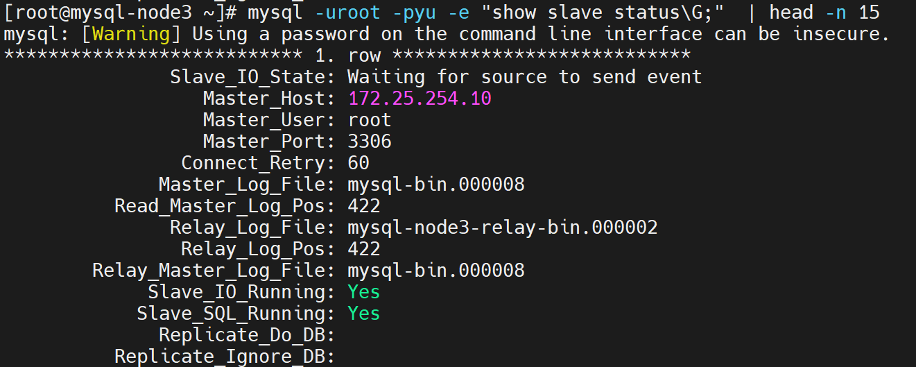 [root@mysql-node1 ~]# mysql -uroot -plee -h172.25.254.10