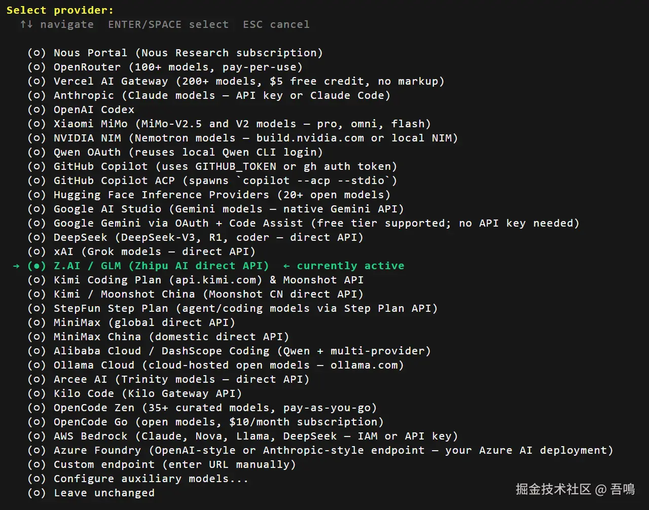 选择了快速启动之后,便可以开始选择大模型,Hermes Agent支持的模型很多,像主流的Claude、Gemini、OpenAI、MiniMax、DeepSeek、Kimi等都支持。