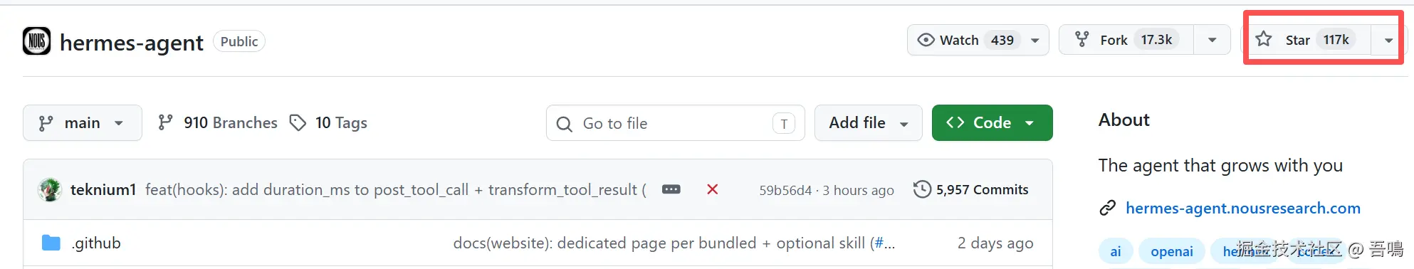Hermes Agent是由Nous Research团队开发的一个开源自主AI智能体框架,它是在2026年2月正式发布的,3月份开始爆发,到4月尾声,开源项目的Star数量已经达到11.7万,增加非常迅速。