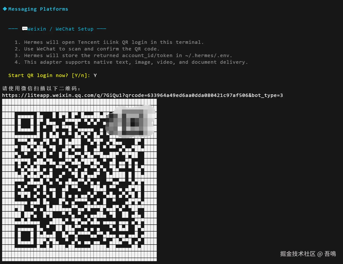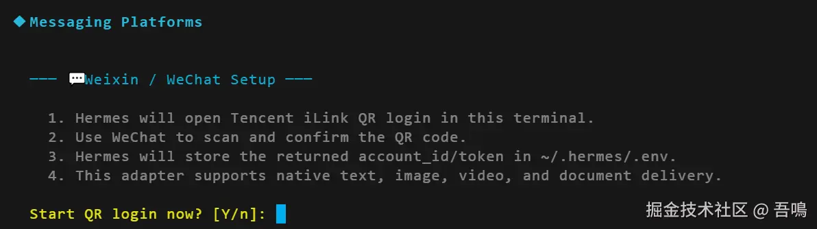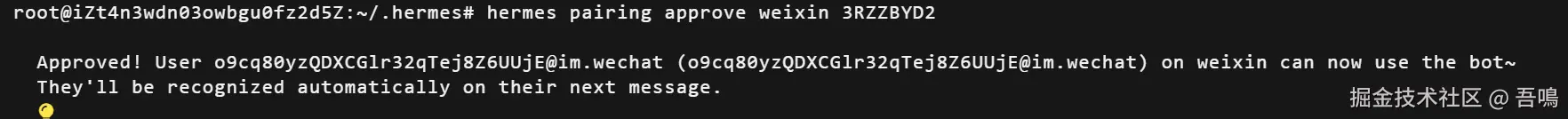 只需要按照指示,到Hermes Agent端执行命令,便可以让微信和Hermes Agent建立起联系。