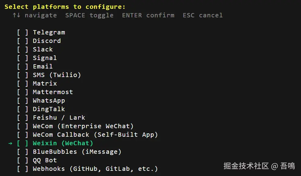 Hermes Agent的配置相比于OpenClaw的配置要简单很多,只需要配置模型和IMessage平台就可以了。