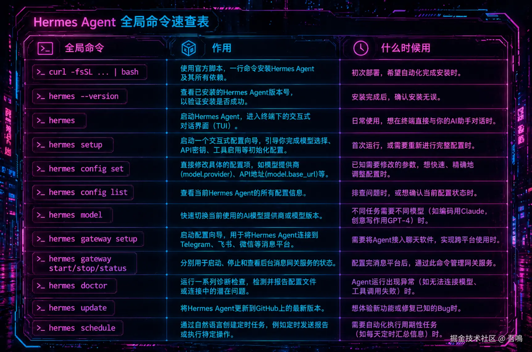 这些命令在终端的Shell中直接调用,用于安装、配置、管理和维护Hermes Agent本身。