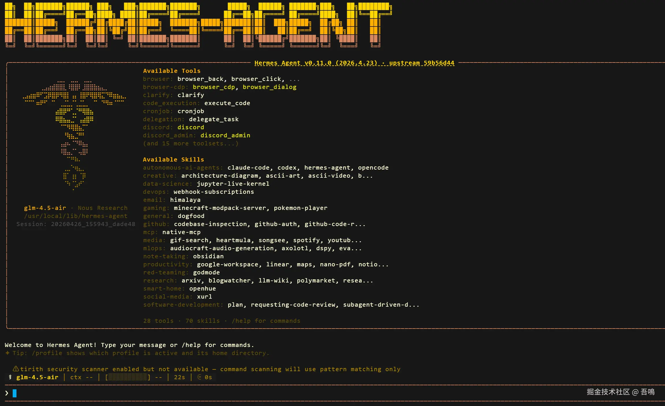 到这里,Hermes Agent的配置部分就讲完了,按照文档进行操作,到这里,你的Hermes Agent便可以正常跑起来了,怎么样?是不是比OpenClaw简单多了?