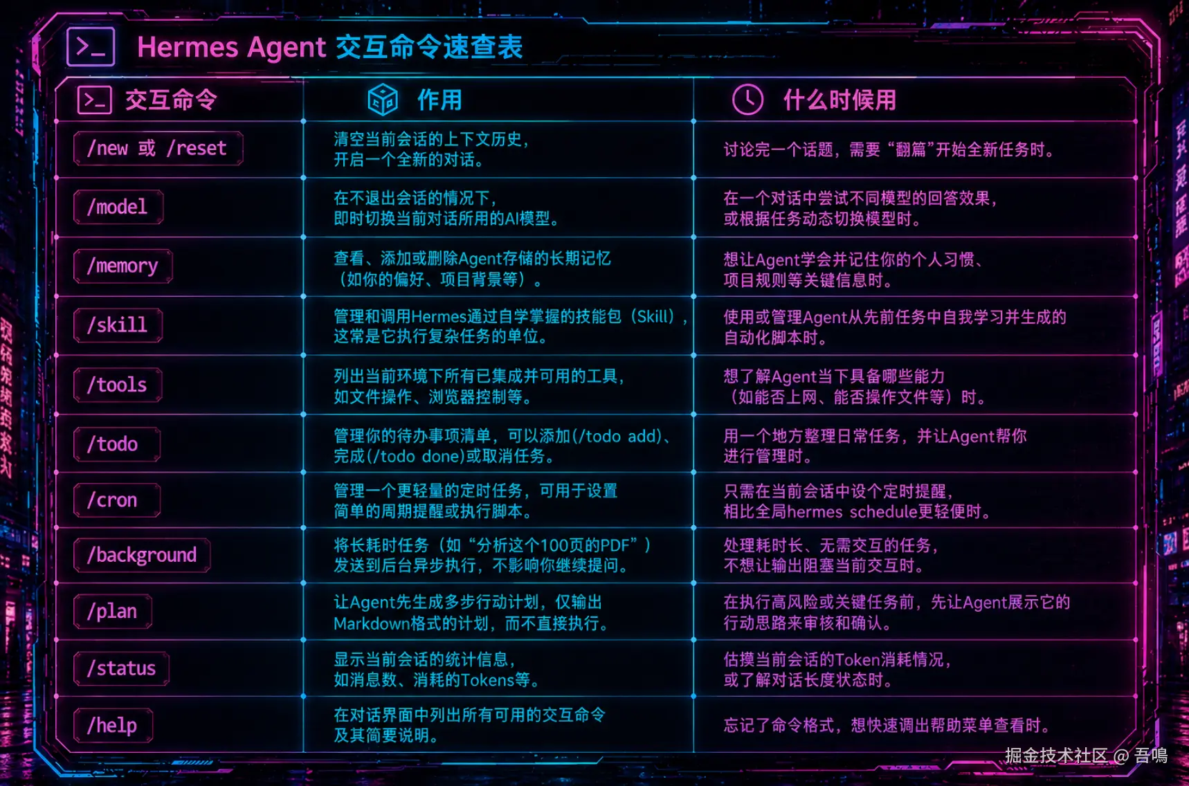 启动hermes进入对话界面后,这些命令用于控制对话、管理记忆和调用Agent的各项功能。