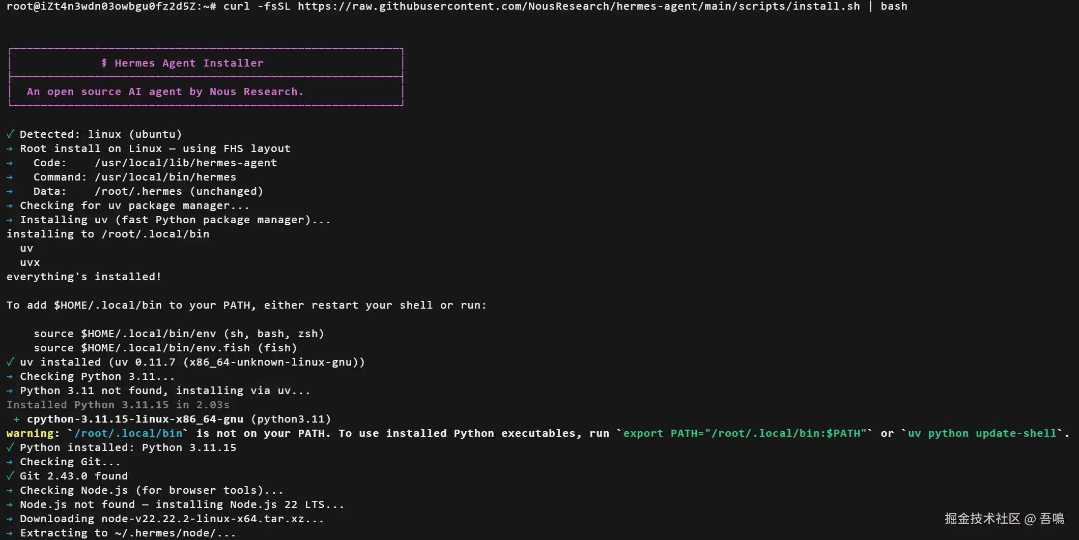 只需要在Linux系统上输入上面的命令行,便开始进行Hermes Agent的安装。