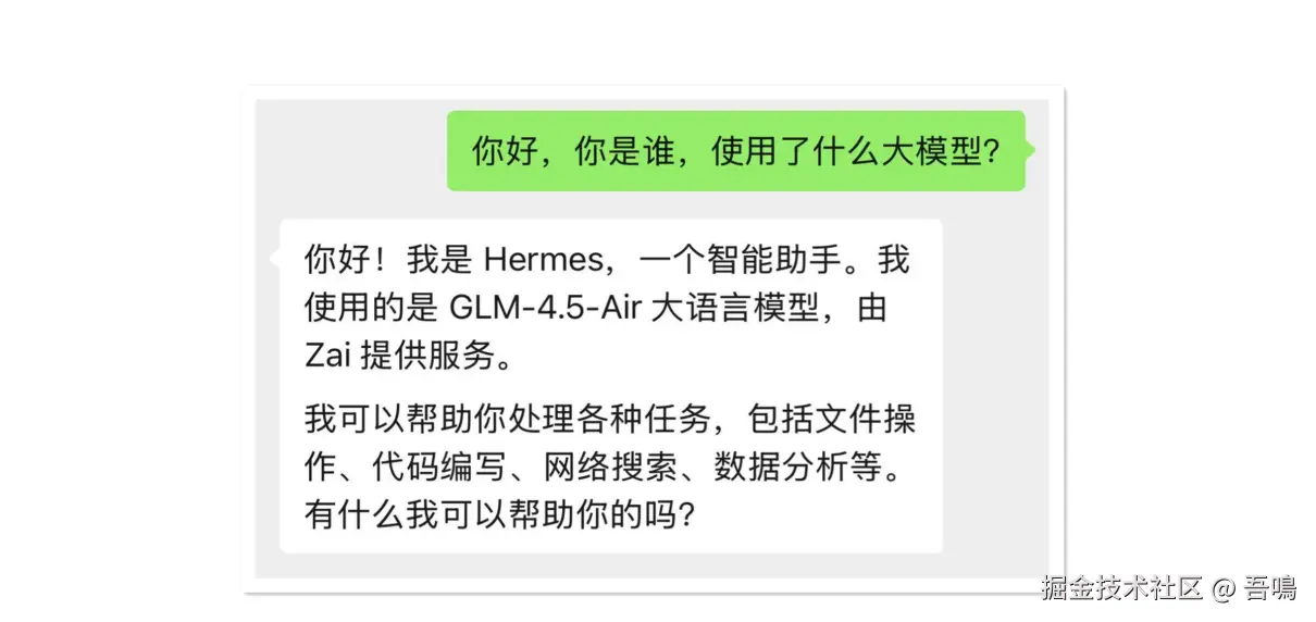 命令执行完成之后,微信上面再去和Hermes Agent交流,它便可以回复你了。