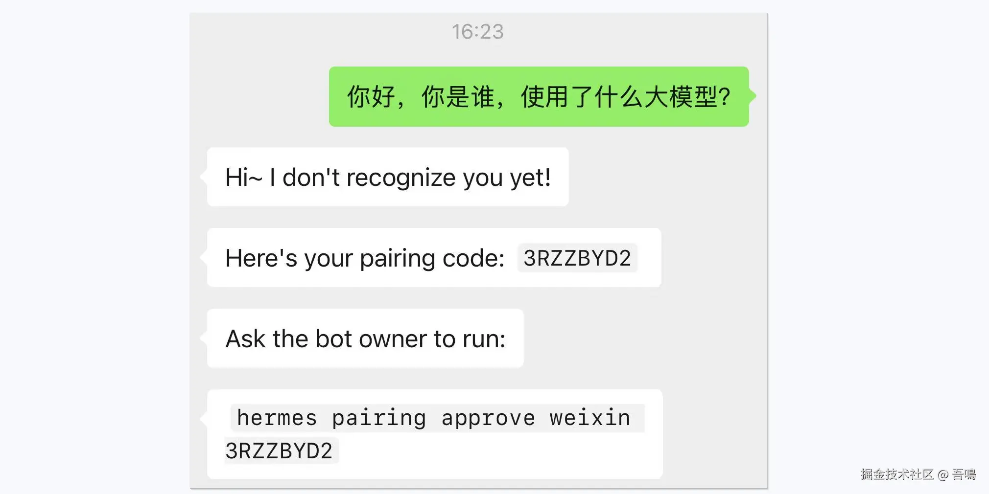 这个时候当你在微信端给Hermes Agent发送命令时,会提示你还没有注册,需要提供验证码给Hermes Agent进行注册。