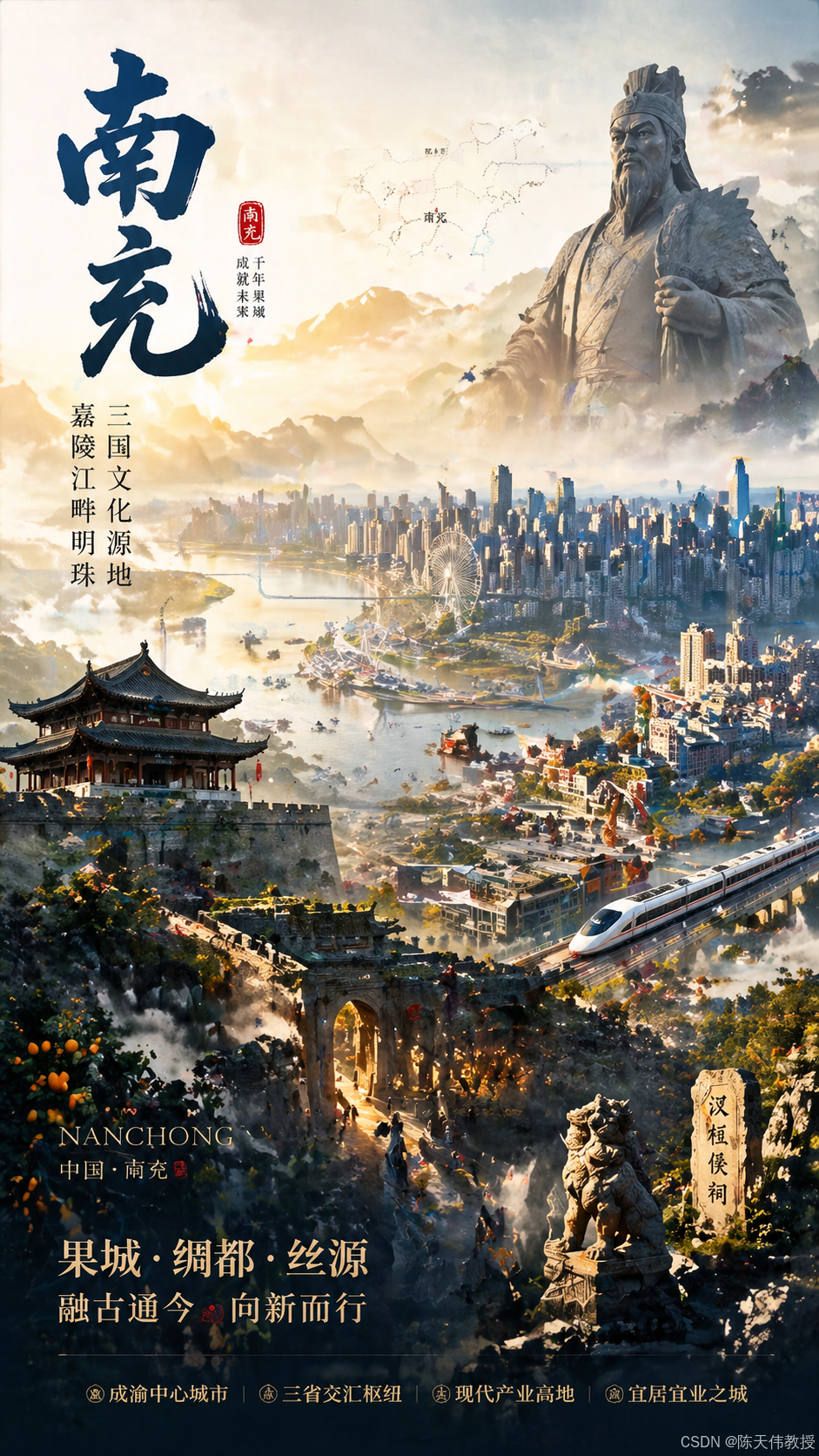 请为【南充】生成竖版城市宣传海报。不要套用固定模板,要先提炼这座城市最独特的文化背景、地理环境、产业发展和城市理念,再据此设计画面结构。 画面必须让人一眼看出这是【南充】:选取该城市最具辨识度的历史文化符号、自然地理符号、现代地标、产业特征、生活气质和未来愿景。构图不固定,可根据城市特色自由安排前景、中景、远景和动势元素。 要求体现: 历史文化:该城市的传统建筑、地域文化、民俗、历史记忆或精神象征。 当下发展:现代天际线、产业特色、交通、商业、科技、金融、港口、生态等。 城市理念:用视觉隐喻表现这座城市的精神,比如开放、创新、烟火气、国际化、山水人文、未来科技等。 海报质感:竖版 9:16,高端国潮城市宣传海报,写实数字绘景与水墨/光影融合,电影级光影,高细节,商业海报排版。 文字:城市名"【南充】"可作为书法主标题,另加一句符合城市气质的宣传语;避免大量小字乱码。 不要通用城市拼贴,不要错误地标,不要廉价旅游广告感,不要卡通风,不要水印。