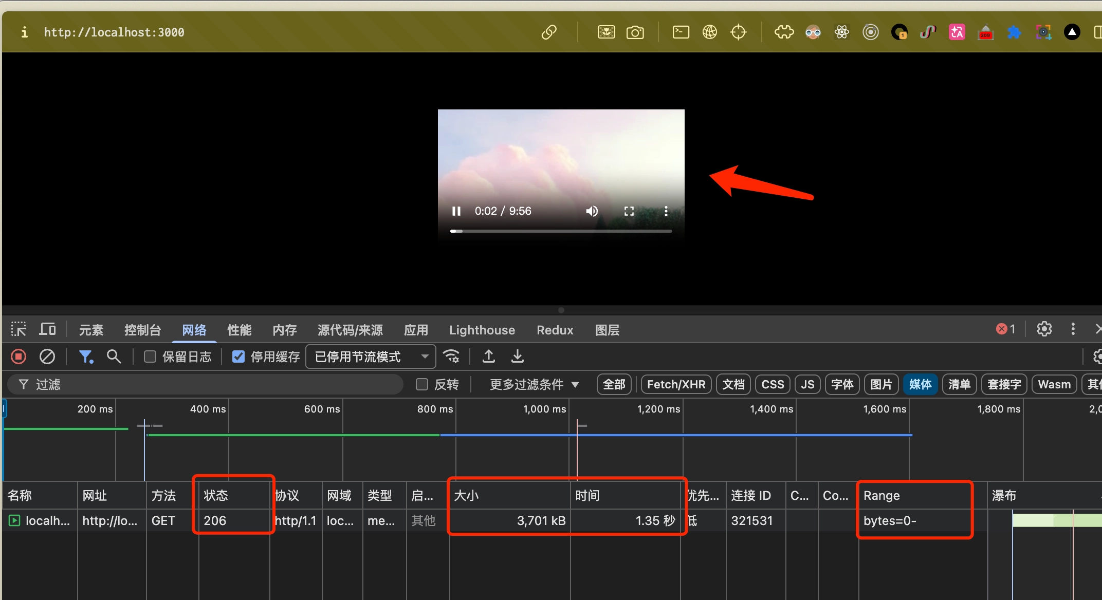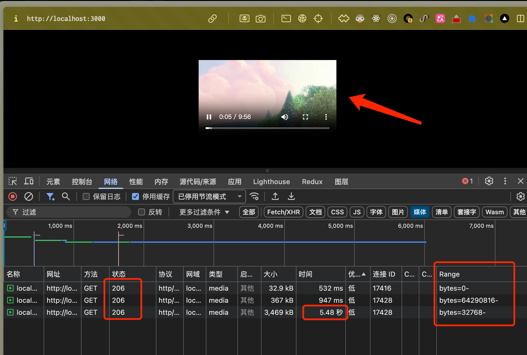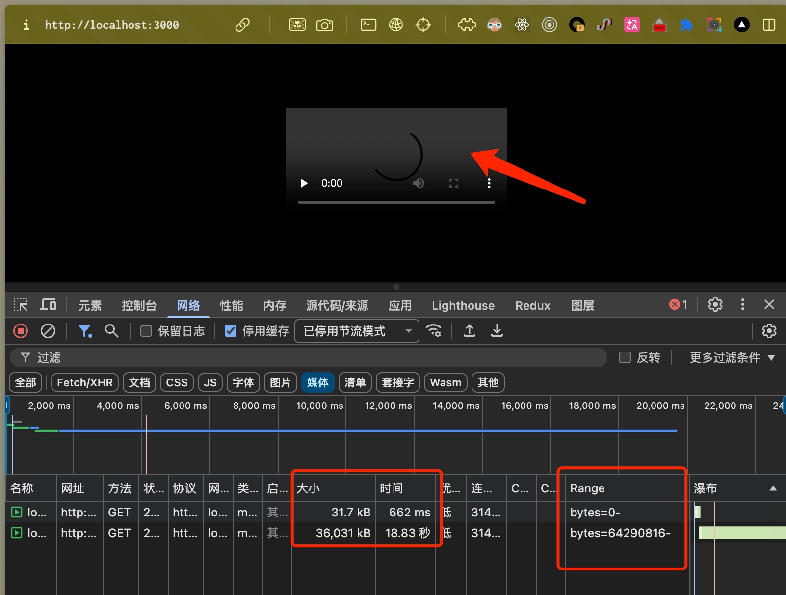 - 浏览器请求全量的Range, 但是服务没处理, 一条持续下载的 200 请求, 但是却在刚下载前一段资源后就已经可以播放了