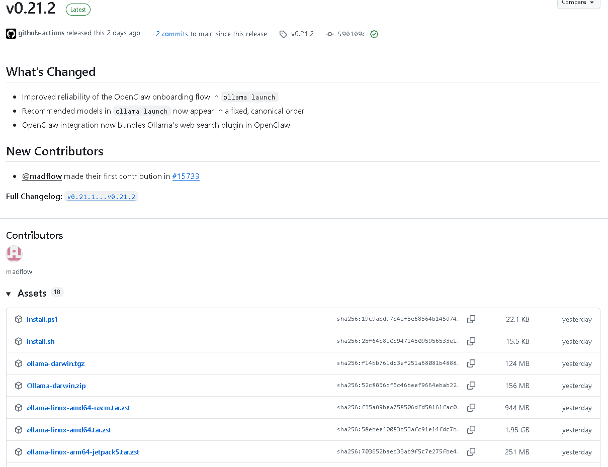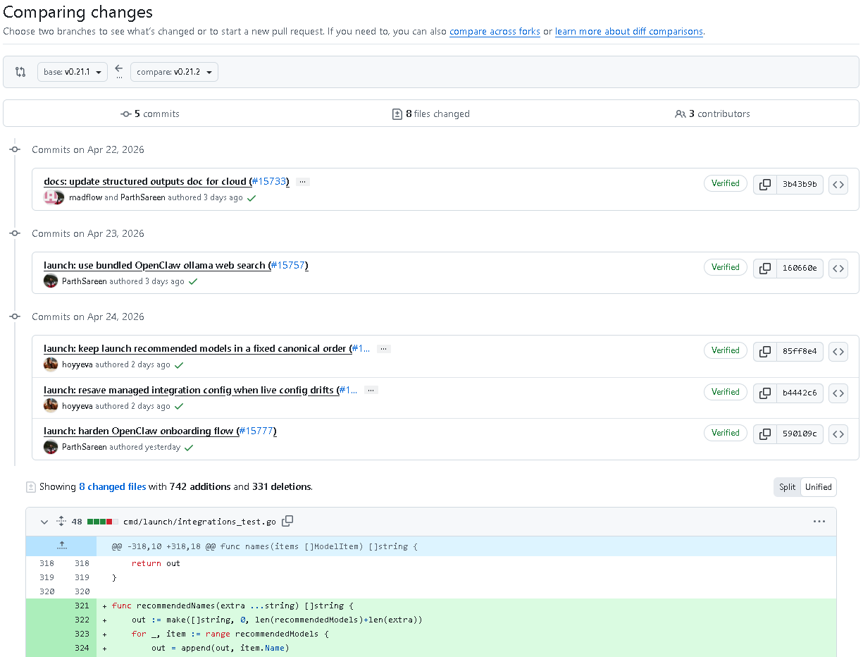 如果你最近正在使用 ollama launch、OpenClaw 集成,或者关注模型推荐顺序与配置一致性,这次 v0.21.2 是值得升级和仔细了解的一版。