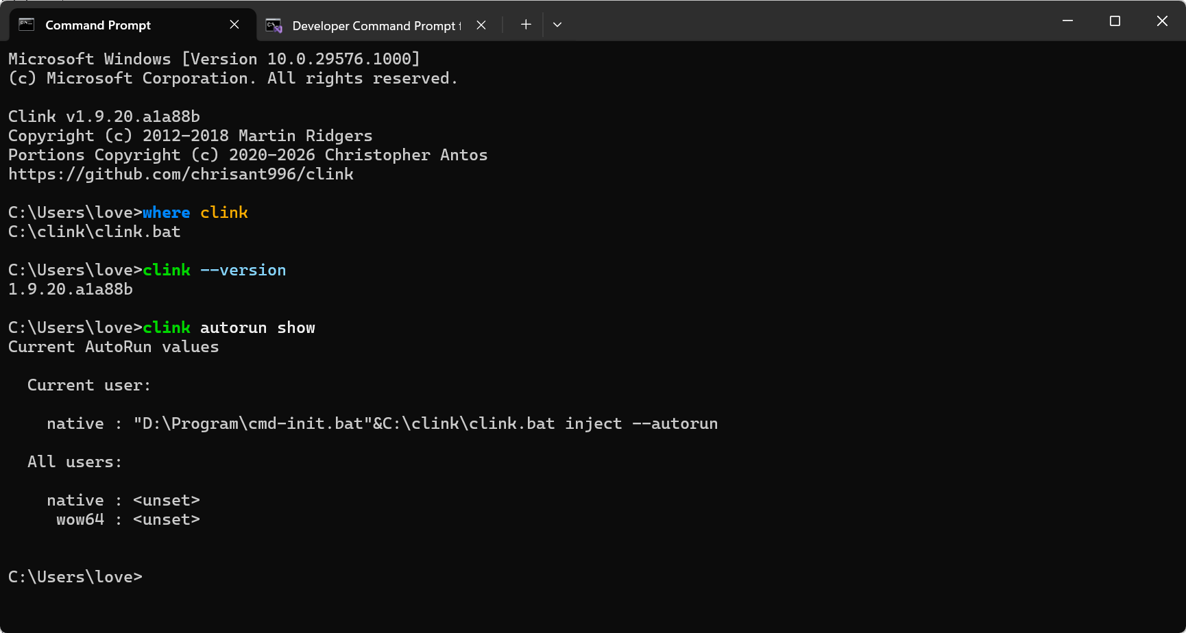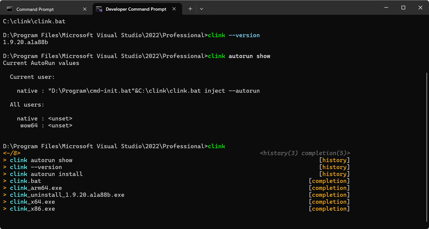 Clink 通过修改注册表 HKCU\Software\Microsoft\Command Processor\AutoRun 实现自动注入。但 VS 2022 Developer Command Prompt 的启动逻辑较为特殊: