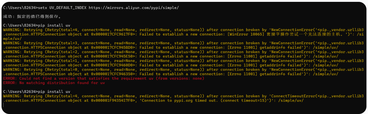# 如果上边命令一直下载失败,则使用下边命令,指定uv源地址为阿里