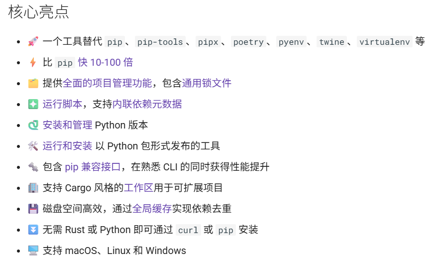 具体的安装方式大家可以参考官方文档:https://uv.doczh.com/getting-started/installation/