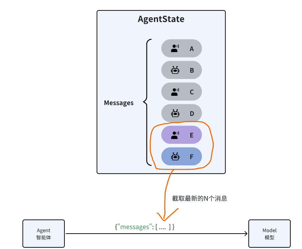 修剪消息并不是真正的删除消息,在AgentState中的消息列表依然是完整的,只不过发送给LLM之前会进行修剪,只保留一部分消息。
