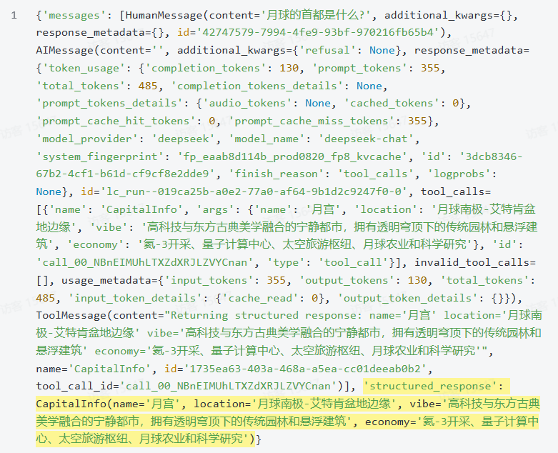 由于两次调用使用了相同的thread_id,被认定为是同一次对话,所以LangChain会在请求模型时携带历史对话的Messages,模型就能根据历史消息来正确回答了:
