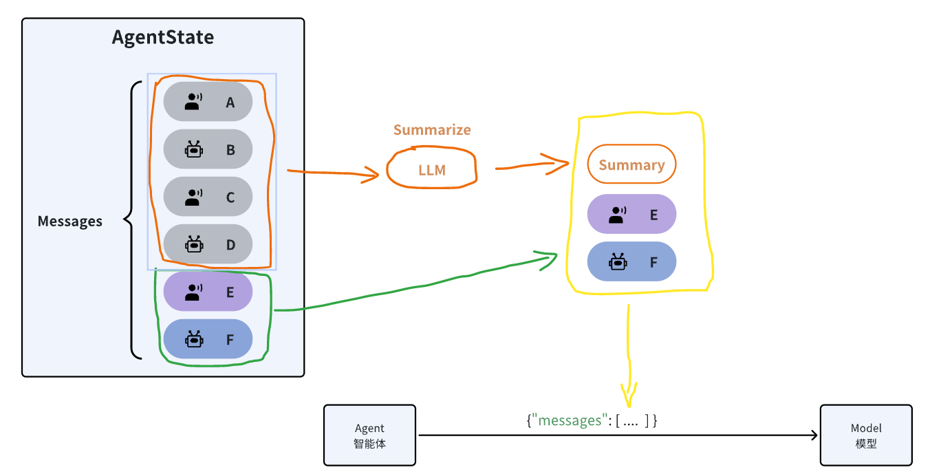 不管是修剪还是删除,都会导致一部分消息丢失,从而丢失记忆。所以就有了第三种策略:总结消息(Summarize Messages)