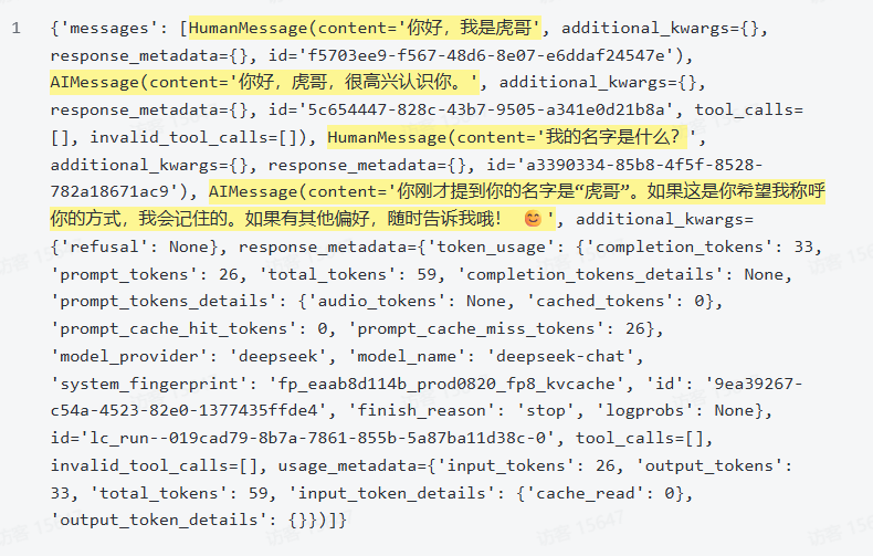{'messages': [HumanMessage(content='你好,我叫虎哥,我最喜欢猫猫。', additional_kwargs={}, response_metadata={}, id='986d4740-b0dd-4888-ae6a-3eb32454c272'), AIMessage(content='虎哥你好!很高兴认识你!🐯✨ \n喜欢猫猫的人一定都有颗温柔的心呢~你家里有养猫吗?还是喜欢云吸猫?如果聊起猫咪的话题,我可以陪你聊很久哦!😸', additional_kwargs={'refusal': None}, response_metadata={'token_usage': {'completion_tokens': 50, 'prompt_tokens': 15, 'total_tokens': 65, 'completion_tokens_details': None, 'prompt_tokens_details': {'audio_tokens': None, 'cached_tokens': 0}, 'prompt_cache_hit_tokens': 0, 'prompt_cache_miss_tokens': 15}, 'model_provider': 'deepseek', 'model_name': 'deepseek-chat', 'system_fingerprint': 'fp_eaab8d114b_prod0820_fp8_kvcache', 'id': '55e64e65-82dc-4698-9a58-76bad566e953', 'finish_reason': 'stop', 'logprobs': None}, id='lc_run--019ca8cf-ee63-7c81-b5d0-69fdc73b1ae3-0', tool_calls=[], invalid_tool_calls=[], usage_metadata={'input_tokens': 15, 'output_tokens': 50, 'total_tokens': 65, 'input_token_details': {'cache_read': 0}, 'output_token_details': {}}), HumanMessage(content='我最喜欢的动物是什么?', additional_kwargs={}, response_metadata={}, id='c8e7382d-3fa3-44b8-afc6-0ed965ad2abb'), AIMessage(content='根据我们之前的对话,你提到自己"最喜欢猫猫",所以毫无疑问------你最喜欢的动物是**猫猫**!🐱❤️ \n\n需要聊聊猫咪的品种、趣事,或者分享猫片吗?我随时待命~(笑)', additional_kwargs={'refusal': None}, response_metadata={'token_usage': {'completion_tokens': 53, 'prompt_tokens': 74, 'total_tokens': 127, 'completion_tokens_details': None, 'prompt_tokens_details': {'audio_tokens': None, 'cached_tokens': 64}, 'prompt_cache_hit_tokens': 64, 'prompt_cache_miss_tokens': 10}, 'model_provider': 'deepseek', 'model_name': 'deepseek-chat', 'system_fingerprint': 'fp_eaab8d114b_prod0820_fp8_kvcache', 'id': '10f6fec4-764c-49a7-bb9d-2fa45c08fbfb', 'finish_reason': 'stop', 'logprobs': None}, id='lc_run--019ca8d0-dfe3-7e43-8be2-bcf669aa95e1-0', tool_calls=[], invalid_tool_calls=[], usage_metadata={'input_tokens': 74, 'output_tokens': 53, 'total_tokens': 127, 'input_token_details': {'cache_read': 64}, 'output_token_details': {}})]}