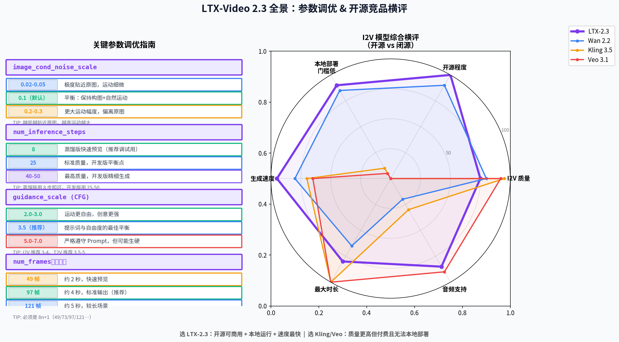 选 LTX-2.3 的理由:开源可商用 + 消费级显卡可跑 + 速度快(接近实时)+ 双帧控制。选 Kling/Veo 的理由:质量更高(特别是人物面部和复杂运动),但需要付费且无法本地部署。