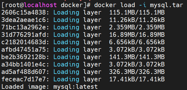 作用:将离线包中的镜像导入到本地 Docker 环境。docker load -i mysql.tar