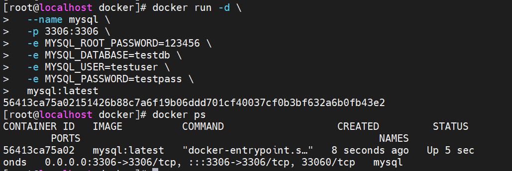 - -p 宿主机端口:容器端口:端口映射,将宿主机 3306 端口(冒号前面)映射到容器内部 3306 端口(冒号后面 );