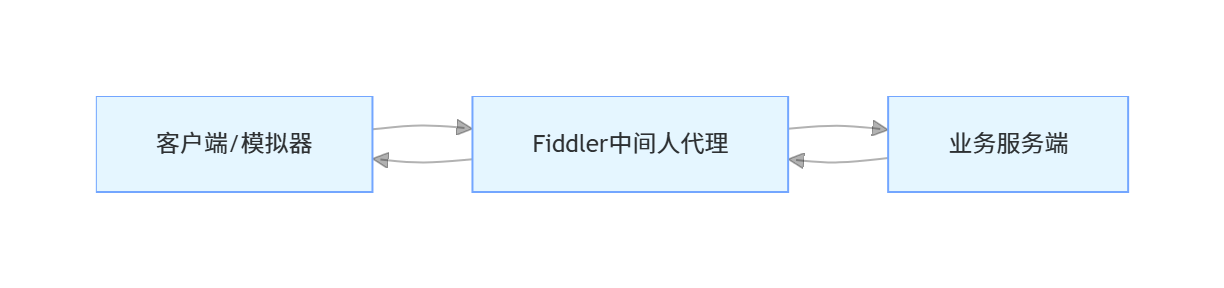 接入Fiddler代理后的通信链路:客户端所有网络请求优先定向转发至Fiddler本地代理端口,Fiddler完成数据包实时解析、日志留存、链路转发后,再将合规请求同步推送至目标业务服务器;服务器返回响应数据时,会先回流至Fiddler,最后由Fiddler回传给客户端。
