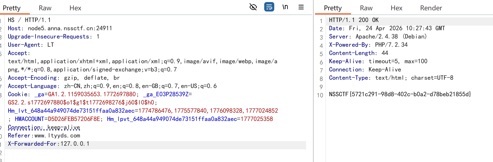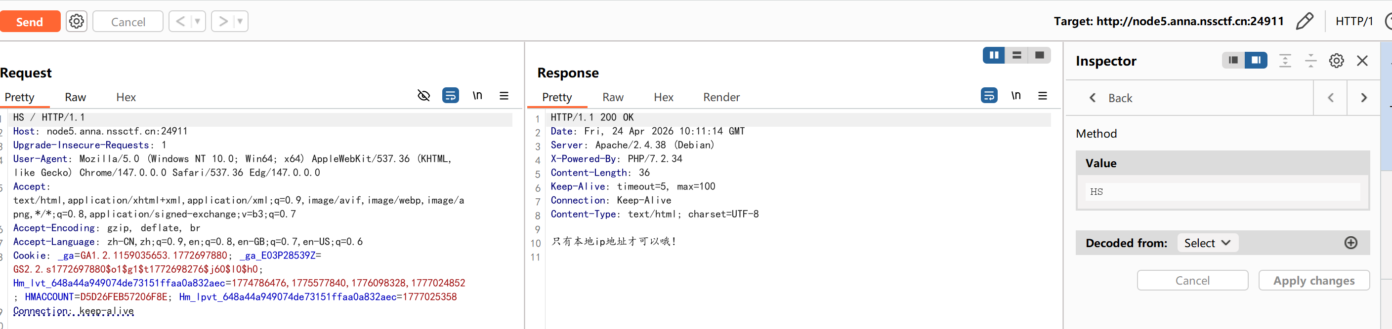 这题其实就是在考察http请求头的修改应用,本人卡在了第一步这个HS这个请求方式没见过,不知道是请求方式,在修改时,因为很多的请求过来,不知道哪一个是我需要修改的,同时其他的请求头内容有点生疏。