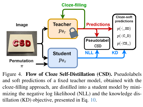为解决这个问题,提出了一种新的填空自蒸馏(CSD)技术。在CSD中,首先训练一个作为教师的模型,用于生成训练数据的预测。然后通过Cloze fill方法对这些预测进行细化:每个字符都被重新预测,使用所有其他字符作为文本上下文,从而获得更准确、信息丰富且具上下文感知性的软预测。随后,我们将教师的硬预测作为实地真实和知识提炼项,将教师的有限上下文预测(通过置换语言建模获得)与教师全上下文填空预测之间的差异最小化,将教师提炼成同一训练集中的学生模型。该技术使学生能够在有限上下文限制下,更新其参数,适应教师更丰富、更具上下文感知的输出。实验证明CSD在减少标签噪声和不一致方面具有显著效果,从而显著提升表现。