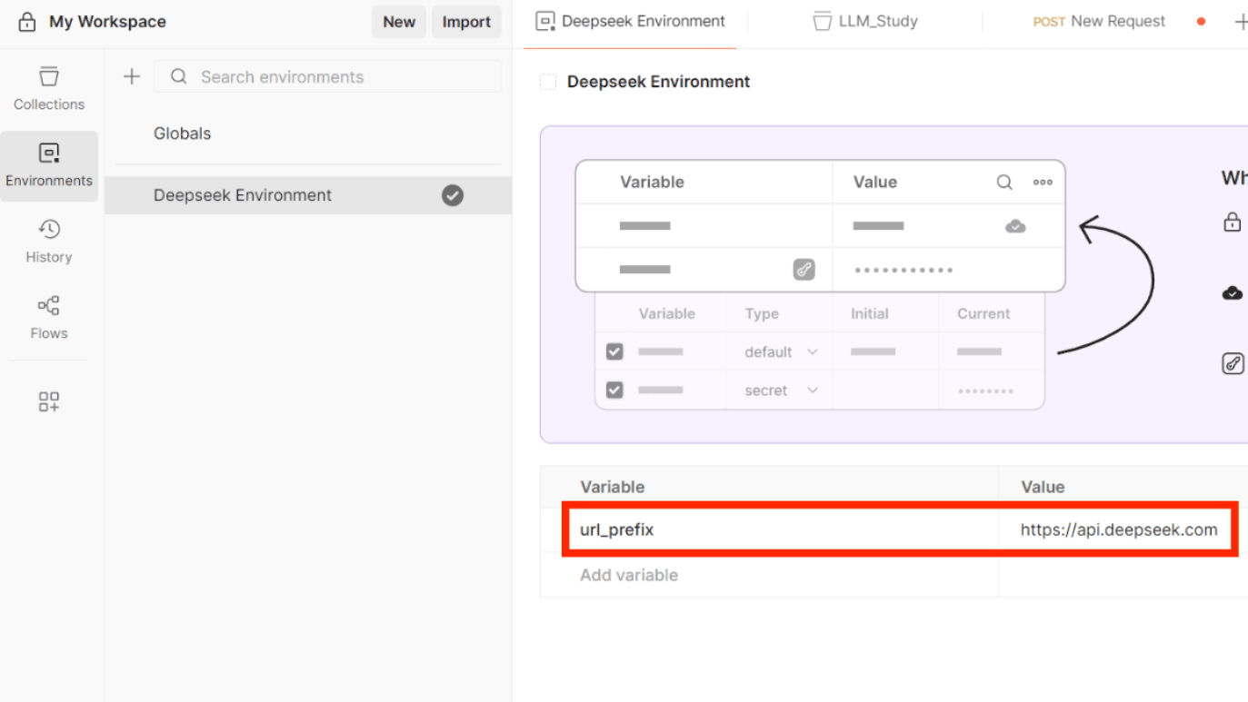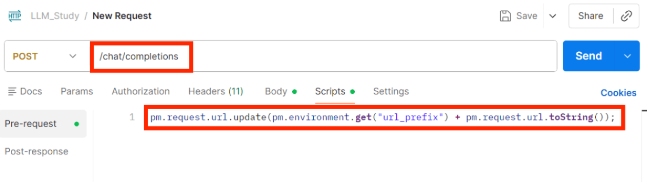 (3)设置前置脚本于url:新建Collection,点击Scripts,选择Pre-request Script选项卡,将下面代码写入并保存;使用POST请求,url填写/chat/completions