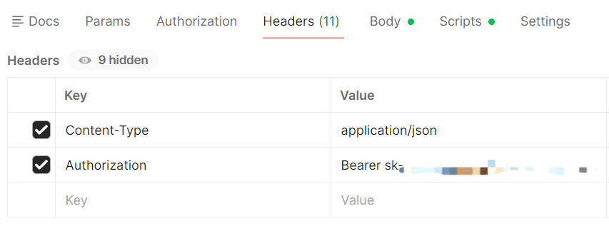 (4)配置Headers 和 body:Header中配置两个key如下,Authorization中写入Bearer[空格][你的API key]。Body选择JSON格式,content为你要输入的提示词。