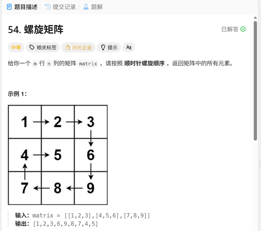 这道题我们采用标记的方式,走的方式从左上角开始,沿着右下左上的方位进行螺旋。