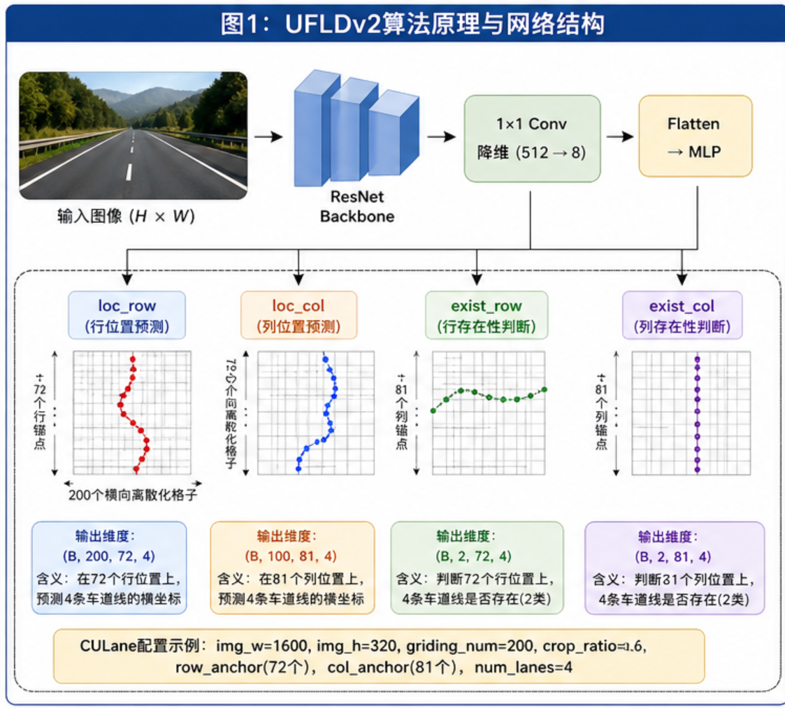 UFLDv2(Ultra Fast Lane Detection v2)的核心思想是:不逐像素分割车道线,而是将车道线检测转化为行/列锚点上的位置分类问题。这种设计让它的推理速度极快,非常适合ADAS这种对实时性要求很高的场景。
