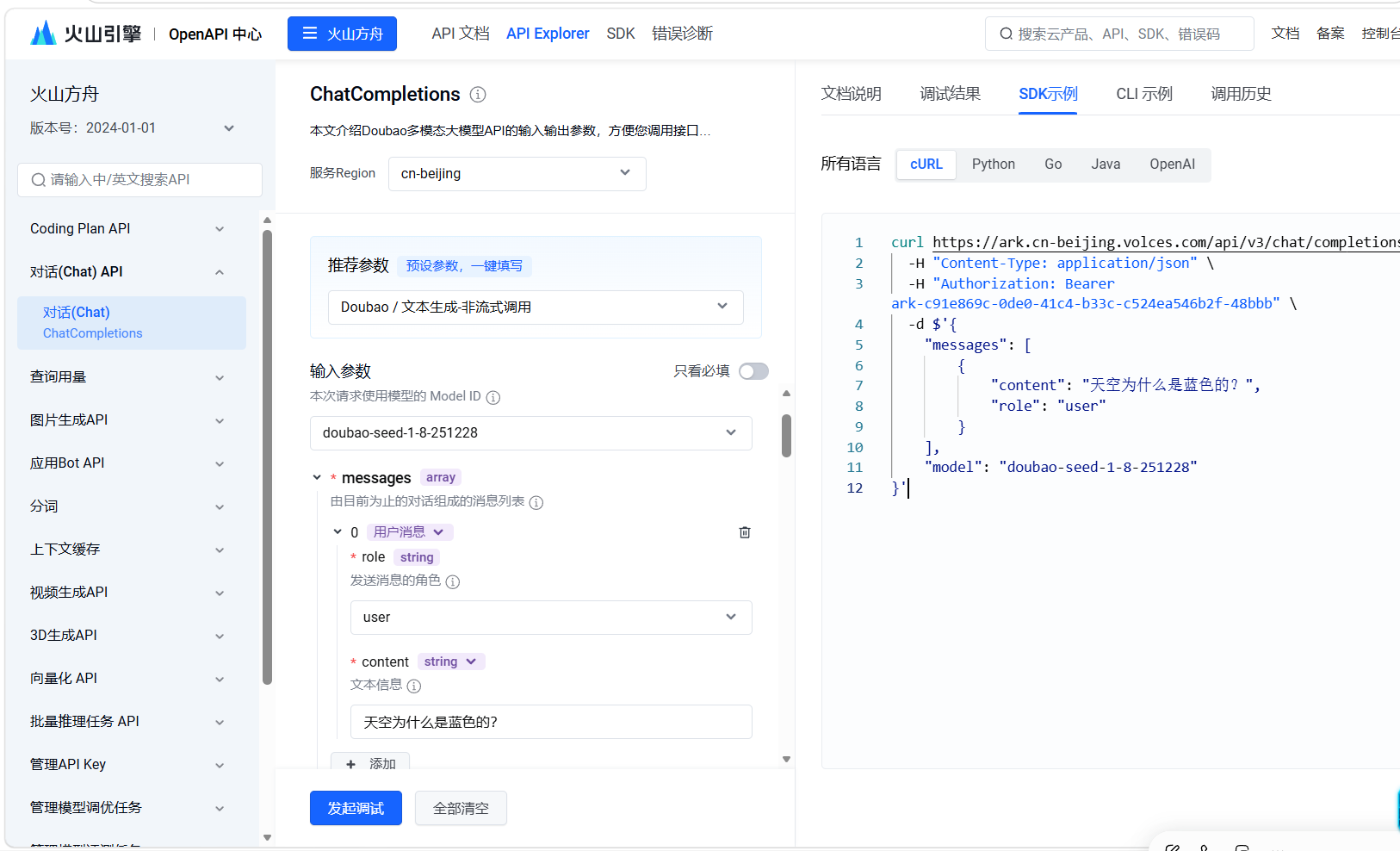 鉴权方式:Bearer Token(API Key从火山引擎控制台创建)