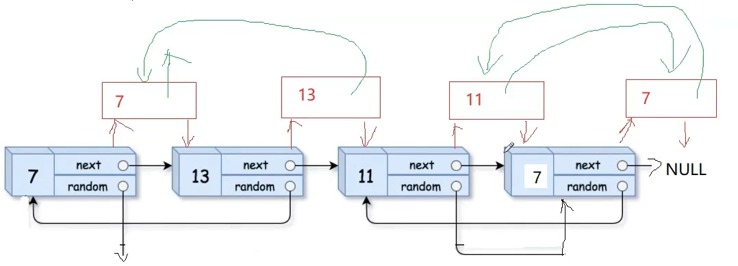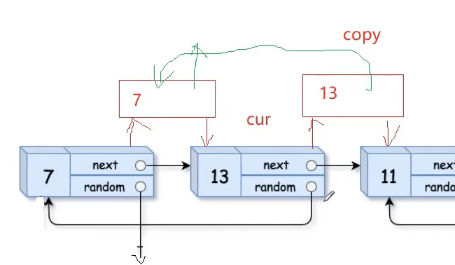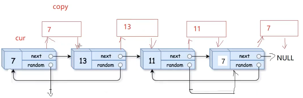 · 如果random不为空,拷贝节点的random就等于cur->random->next,如下图: