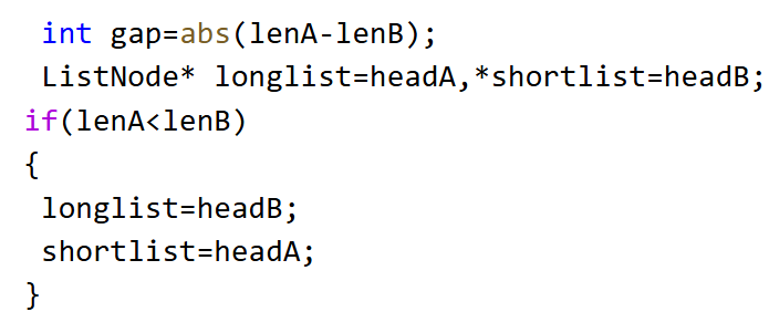 ListNode* longlist=headA,*shortlist=headB;