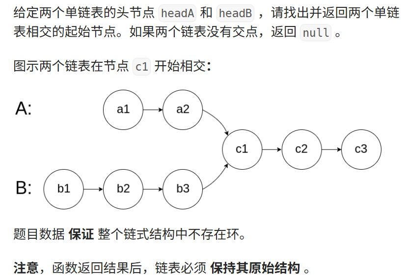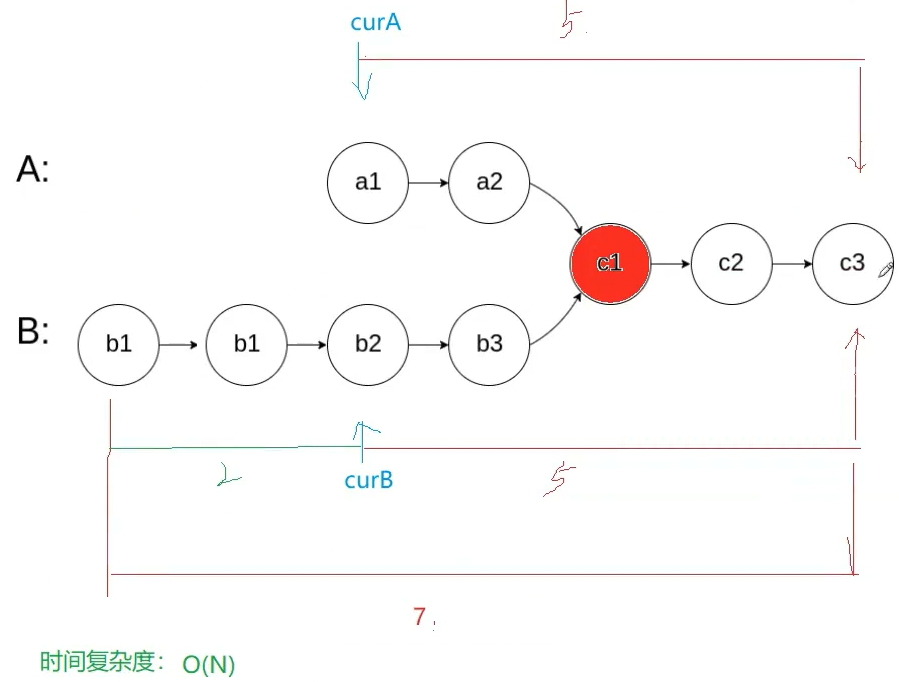 **2.**返回相交的起始节点:记录两链表的长度,长的先走差距步,然后同时走,出现第一个相同的节点就是交点。