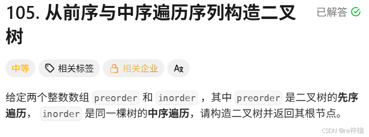 以下是该题的链接:105. 从前序与中序遍历序列构造二叉树 - 力扣(LeetCode)