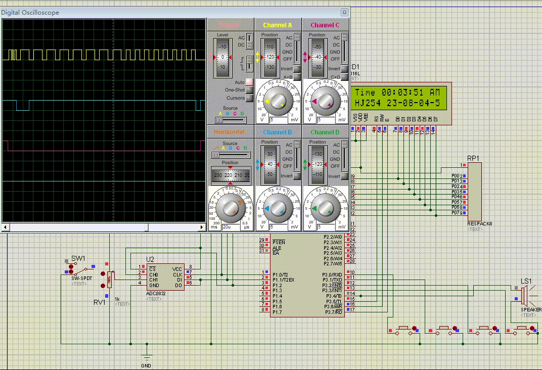 作为单通道模拟信号输入时ADC0832的输入电压是0~5V,且8位分辨率时的电压精度为19.53mV。如果作为由IN+与IN-输入的输入时,可将电压值设定在某一个较大范围之内,从而提高转换的宽度。但值得注意的是,在进行IN+与IN-的输入时,如果IN-的电压大于IN+的电压则转换后的数据结果始终为00H。