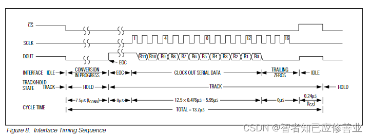 如资料 所示,当此2 位数据为"1"、"0"时,只对CH0 进行单通道转换。当2位数据为"1"、"1"时,只对CH1进行单通道转换。当2 位数据为"0"、"0"时,将CH0作为正输入端IN+,CH1作为负输入端IN-进行输入。当2 位数据为"0"、"1"时,将CH0作为负输入端IN-,CH1 作为正输入端IN+进行输入。到第3 个脉冲的下沉之后DI端的输入电平就失去输入作用,此后DO/DI端则开始利用数据输出DO进行转换数据的读取。从第4个脉冲下沉开始由DO端输出转换数据最高位DATA7,随后每一个脉冲下沉DO端输出下一位数据。直到第11个脉冲时发出转换数据最低位DATA0,一个字节的数据输出完成。也正是从此位开始输出下一个相反字节的数据,即从第11个字节的下沉输出DATA0。随后输出8位数据,到第19 个脉冲时数据输出完成,也标志着一次A/D转换的结束。最后将CS置高电平禁用芯片,直接将转换后的数据进行处理就可以了。