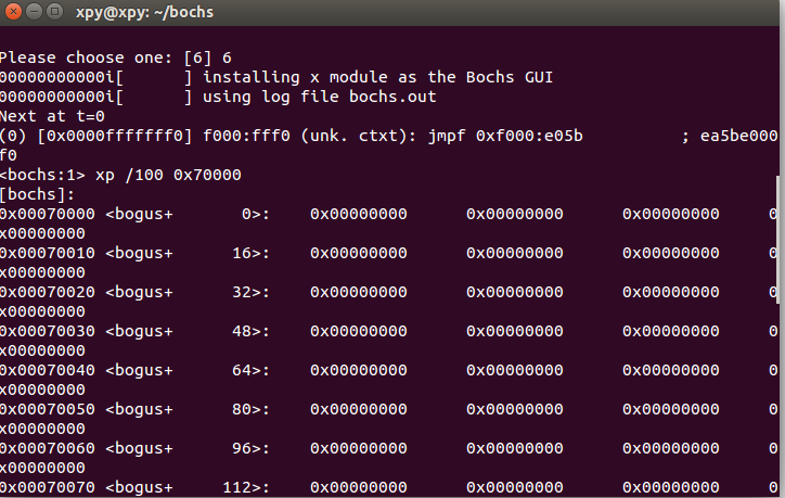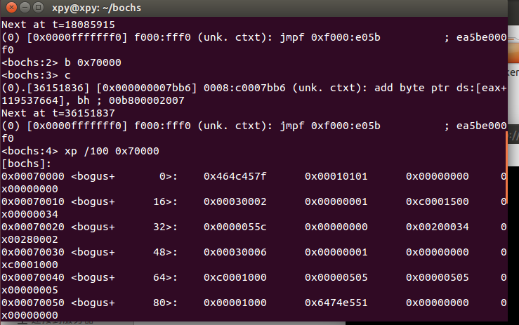 在bochs仿真软件内输入命令:xp /100 0x70000 ,查看内存0x70000处是否存储的是内核二进制文件信息:
