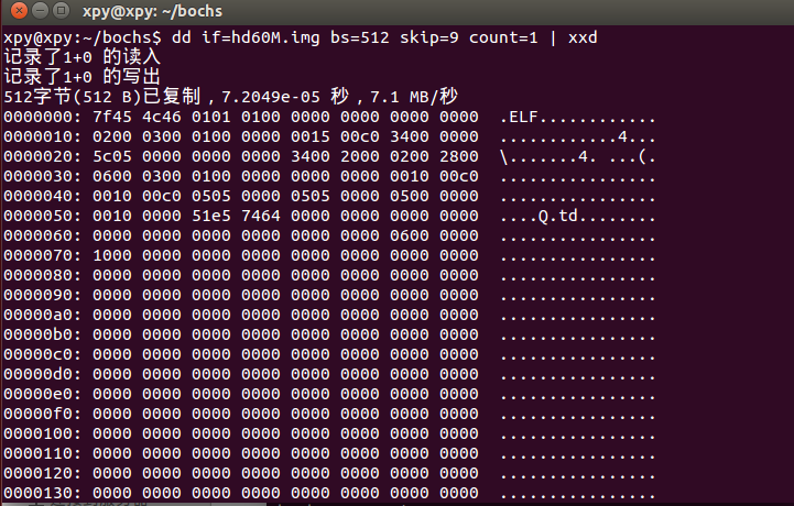 # 从 hd60M.img 读取第9扇区开始的200个扇区,查看开头是否是ELF魔数 0x7f454c46