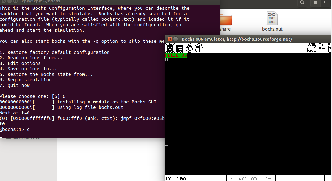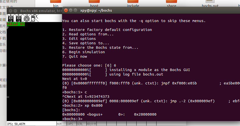 进入bochs进行仿真运行,输入以下命令: